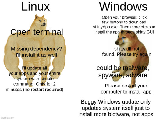arrow-up12arrow-down1imageLinux vs Windowslemmy.worldTux@lemmy.worldM to Technology Memes@lemmy.worldEnglish · 1 year agomessage-square0linkfedilinkcross-posted to: linuxmemes@lemmy.world