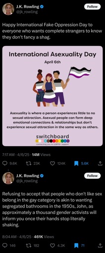 That means they’re probably significantly less likely to objectify or assault you than someone who isn’t ace. Isn’t that a good thing for someone supposedly so concerned with being objectified and violated, Miss Rowling?
