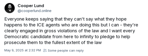It would be even better if the purely theoretical dem got the names and addresses of ICE people down to the enforcement officer level and leaked that to the media, put it up on the net as a torrent, etc. I know this is as likely as a wizards being real but a man can dream - can’t he?