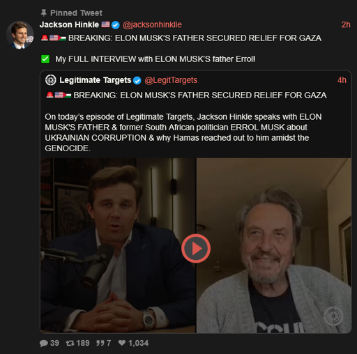 They praise Elon for like a solid 30 minutes. Hinkle says he loves everything about Elon except for working with Netanyahu. Errol Musk describes Israel as an ideal society, says that Israel is “civilized”. Both say that they hate the South Africa ANC.