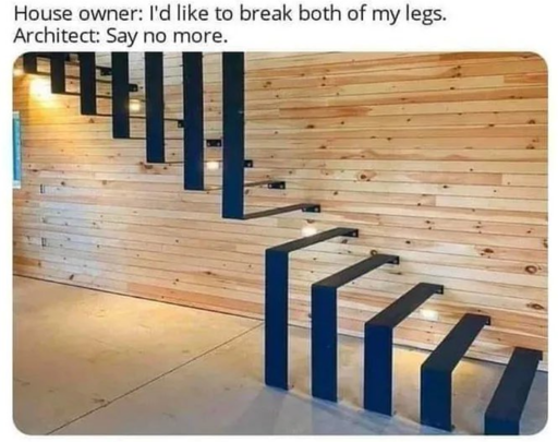 you laugh at the absurdity that somebody with a silly idea that looks “cool” on paper would ever actually make something like this or worse be allowed to make things like this when safer designs exist and are better in every way but in my country the architects of multi-thousand pound metal boxes that hurtle wrecklessly across the landscape murdering pedestrians are lionized with prestige for designing architecture like this.