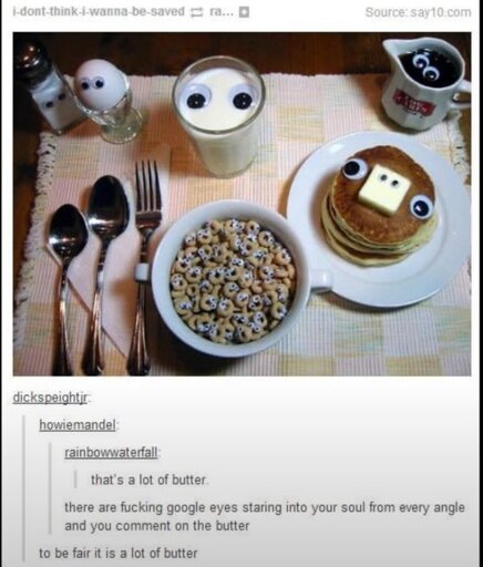 minus-squareLavender [they/them]@hexbear.netlinkfedilinkEnglisharrow-up12·7 months agoShould the utensils have eyes?