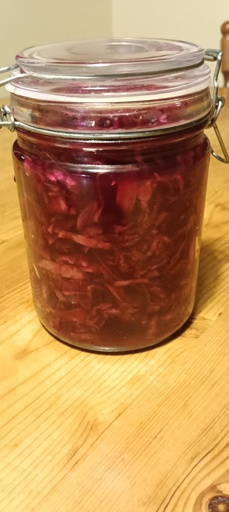 About a month or so ago, I turned two lovely, fresh, full heads of red cabbage, straight from the veggie patch, into a decent sized pile of sauerkraut. Not only does it look like precious stones with a beautiful rich translucent colour, it also tastes amazing and has the most incredible, funky stank going on. One of the better things I’ve ever made, and only my second try at sauerkraut! Obviously I’m pretty happy with myself, but we have one more cabbage left! I want to do something more interesting with it than sauerkraut, though. Any suggestions for other pickled cabbage based foods? I have a nice big porcelain fermenting/pickling crock which is currently empty so it’s the perfect opportunity. One head will only fill it about a quarter or so, so there’s plenty of room to fit more stuff in. I would do something kimchi-inspired, but one of the people who’d be eating it Does Not do chili. I also have loads of carrot available so that might be an option (dad has done the pickled cabbage + daikon that’s often put in banh mi which turned out really well when I made some baguettes for a banh mi lunch for extended family)