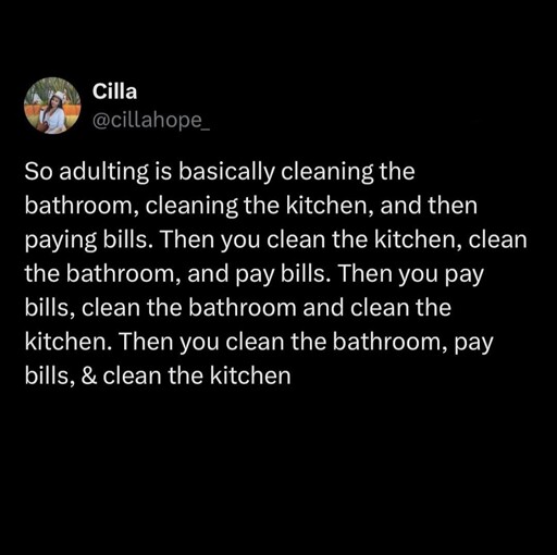 If you don’t like it, you can quit it and open an onlyfans, make millions and vanish. No one forces you to do real adulthood.