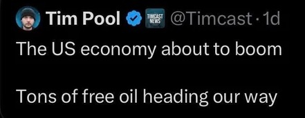 We had “fee oil” during the Bush years and 2007 happened anyways. We’re way past the point of increasing input = increased output. This is even more tragic because people are dying due to imperialism that won’t even work how the imperialists want. Resources won’t save us from the AI crash or whatever looming bubble we don’t know about. If anything it will cause a shock worse than doing nothing. You’ll get all this oil, increase energy output to support AI and then AI shrinks 80% overnight. Now all those energy jobs and resources are worthless since it too must shrink. Deflation is a thing too, chuckles.
