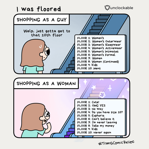 How is this a rehash of women be shopping? I’m a woman, I enjoy shopping, am I not allowed to rejoice in that? Or are you saying that transfeminine people must avoid any kind of behavior or preference associated with western feminine gender roles?