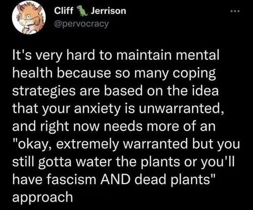 This is actually touching on a real new approach to mental healthcare, which is just accepting that “life is shit” and you’re kinda on your own to find meaning in it, or get to the next high-point that makes it worth living.
