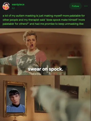So if the client had made unmasking a therapeutic goal and I knew they identified with Spock it might be a fun way to encourage them not to negotiate on points that are entirely their choice.
