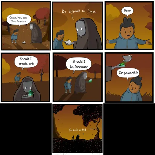 The message is nice, but “being nice” is straight up not a good way to achieve immortality. The people you’ve affected will remember you but one generation out and you’re forgotten. And that assumes people ruminate on the kind acts they’ve experienced a lot.