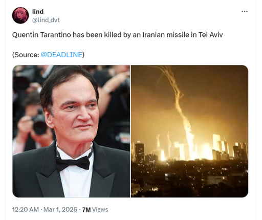 arrow-up11arrow-down1imageQuentin Tarantino has been killed by an Iranian missile in Tel Avivhexbear.netOpheliaAzure [fae/faer]@hexbear.net to fakenews@hexbear.netEnglish · 2 months agomessage-square4linkfedilinkfile-text