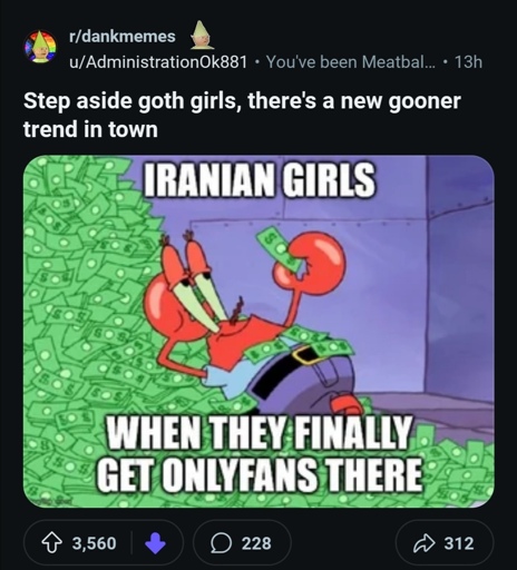 to them it’s just a deprecating joke about being a gooner. they have already sexually objectified and commodified women so that part totally is normalized and not even recognized. How it’s perceived though is as a taunt, a colonizer continuing in the hundreds of years of tradition of sexually assaulting us, trafficking women from our nations to become prostituted and enslaved. This shit will get you murdered if you said it in Iran. It’s reveling in the SA of an entire nation, getting excited to pillage like barbarians of yore and take war “brides” hostage. Then they call us the barbarians.