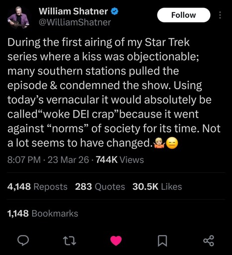 I think Shatner is complicated because (a) he’s 95 years old, and can’t be expected to be fully “in touch,” and (b) he has definitely had some questionable people handling his social media over the years.