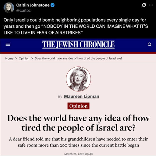 I imagine the people of Israel even more buried in propaganda than we are, Made worse by the fact that they had October 6th (which was allowed to happen, no doubt) and that they are living under constant threat of attack. For the average people of Israel, I sympathize. All of that said, I don’t change my stance. Your leaders have brainwashed you and pushed to to where you are. They have been manipulating your enemies with 4D chess moves for generations to make sure that you HAVE enemies and they have certainly used your fear to dehumanize your neighbors. You can come pander for my support when you change your leaders and arrest Bibi. God helps those that help themselves.