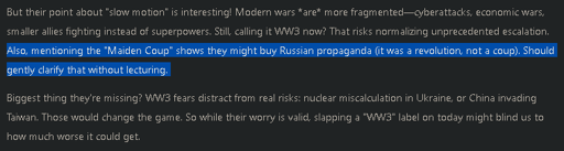 In this case, I asked it if we might be living in a “slow motion World War 3” with the Maiden Coup in Ukraine being the opening shots. The mf thought that I might “buy Russian propaganda” because I called it a coup rather than a revolution.