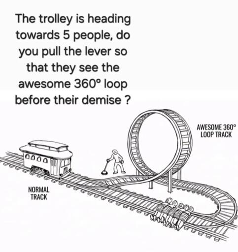 minus-squarearcine@jlai.lulinkfedilinkEnglisharrow-up0·17 days agoThe loop track is longer, and also more likely to damage the trolley and prevent it from going over them. Even on strictly ethical grounds, you should switch tracks, there is a non-zero chance it will save them !
