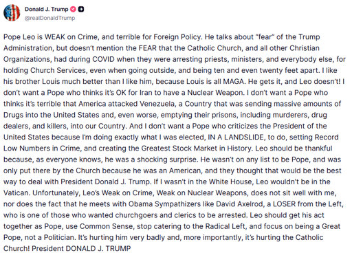Pope Leo is WEAK on Crime, and terrible for Foreign Policy. He talks about “fear” of the Trump Administration, but doesn’t mention the FEAR that the Catholic Church, and all other Christian Organizations, had during COVID when they were arresting priests, ministers, and everybody else, for holding Church Services, even when going outside, and being ten and even twenty feet apart. I like his brother Louis much better than I like him, because Louis is all MAGA. He gets it, and Leo doesn’t! I don’t want a Pope who thinks it’s OK for Iran to have a Nuclear Weapon. I don’t want a Pope who thinks it’s terrible that America attacked Venezuela, a Country that was sending massive amounts of Drugs into the United States and, even worse, emptying their prisons, including murderers, drug dealers, and killers, into our Country. And I don’t want a Pope who criticizes the President of the United States because I’m doing exactly what I was elected, IN A LANDSLIDE, to do, setting Record Low Numbers in Crime, and creating the Greatest Stock Market in History. Leo should be thankful because, as everyone knows, he was a shocking surprise. He wasn’t on any list to be Pope, and was only put there by the Church because he was an American, and they thought that would be the best way to deal with President Donald J. Trump. If I wasn’t in the White House, Leo wouldn’t be in the Vatican. Unfortunately, Leo’s Weak on Crime, Weak on Nuclear Weapons, does not sit well with me, nor does the fact that he meets with Obama Sympathizers like David Axelrod, a LOSER from the Left, who is one of those who wanted churchgoers and clerics to be arrested. Leo should get his act together as Pope, use Common Sense, stop catering to the Radical Left, and focus on being a Great Pope, not a Politician. It’s hurting him very badly and, more importantly, it’s hurting the Catholic Church! President DONALD J. TRUMP