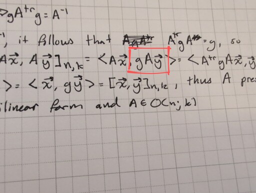 minus-squareLGTM@discuss.tchncs.deOPlinkfedilinkEnglisharrow-up3·edit-21 month agoIn this instance, the proof used the techniques of linear algebra (manipulating the inner product). The proof itself, however, was about Lie groups/topology (proving that the generalized orthogonal group is closed)