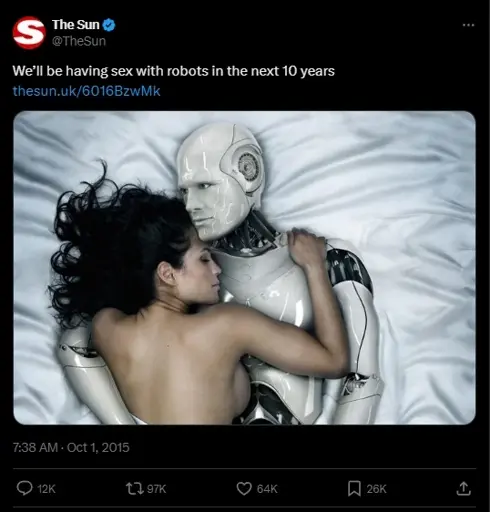 [10-year old article about sex robots being more popular than human sex within 10 years.]