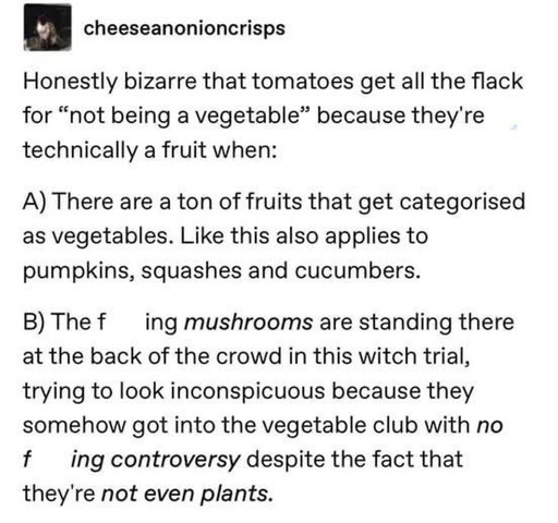 minus-squareqjkxbmwvz@startrek.websitelinkfedilinkEnglisharrow-up1·15 days agoWhy are fruit special though? Leaves and roots are also part of a plant, so why would a tomato not be a vegetable, but lettuce (leaf) and carrot (root) get exemptions?