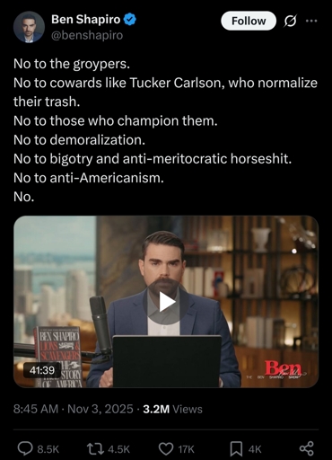 He has excused nazis goosestepping while brandishing swastikas before and will do so again, he does not care if someone openly calls themselves a fascist or a nazi as long as their goals align with his zionist neoconservatism.Wasn’t he writing for iirc Breitbart news at a time they were publishing literal antisemitic conspiracy slop? Or maybe another outlet? I swear they talked about it on Chapo. He is deeply pathetic.