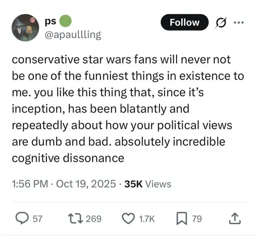 Yuritopiaposadism [none/use name]@hexbear.net to Movies & TV@hexbear.netEnglish · 7 days agoThe conservative Star Trek fans are weirder.hexbear.netimagemessage-square14linkfedilinkarrow-up175arrow-down11