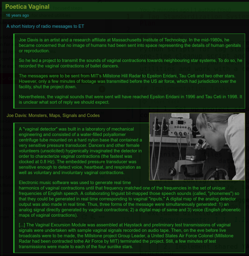 I’d put “hypothetical aliens listening to our radio transmissions won’t know what our vaginas sound like” preeeety far down my list of concerns but you do you, king