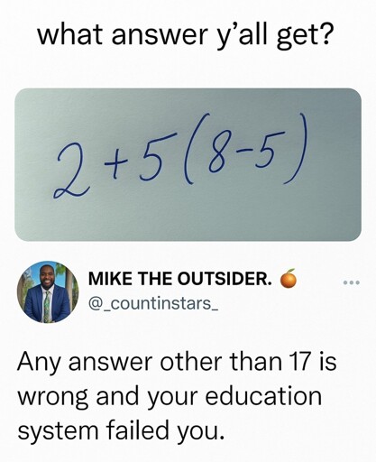 Put a goddamn function sign for the parenthesis. Don’t assume everyone just knows what to do with the parenthesis alone. Fml it bugs me every time this meme gets posted.