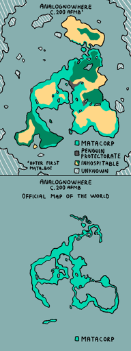 Circa 200 years after the Three MATA Brothers left their bunker to reassert MATACORP dominance over what remained of the destroyed planet, a hobbyist cartographer, Mavic Pengellan, born to an affluent penguin family in one of the Penguin Protectorates, would create his depiction of the world (with a fair amount of creative liberties).