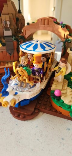 This is modeled after the 70s movie. The book describes the boat as being made of pink glass and was large enough for 100 Oompa Loompa oar rowers.