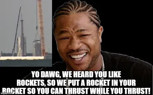 threelonmusketeers@sh.itjust.worksM to SpaceflightMemes@sh.itjust.worksEnglish · 7 days agoYo dawg, we heard you like rockets, so we put a rocket in your rocket so you can thrust while you thrust!sh.itjust.worksimagemessage-square0linkfedilinkarrow-up11arrow-down10file-text