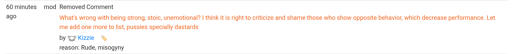 You guys live in Echo chambers. You just assume that your problems and solutions are universality accepted. I don’t think using word pussy is wrong. because of common usage as coward, second even if pussy means women are not courageous as men. which i think is true; very rarely saw women showing uprightness, valour or taking risks, Never heard of a story where woman did suicide assassination like killing VIP with explosions and lack of courage is accepted as woman’s trait in multiple cultures. I think telling otherwise is a lie. People made word unmanliness for a reason, are you guys going to replace its usage from all books? If you think it is not lie, then you should make your case instead of pushing propaganda without properly examining and expecting that people from other cultures are going to accept your so called misogyny bullshit.