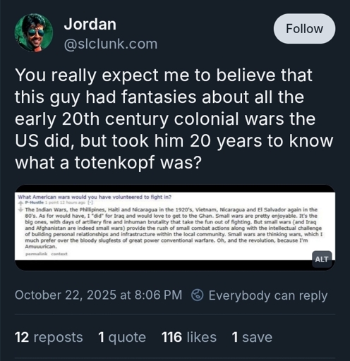 Chapotraphouse@hexbear.net•Platner said he would have volunteered to go to Vietnam and would have participated in American colonial wars including the Indian wars and Phillipines war.English