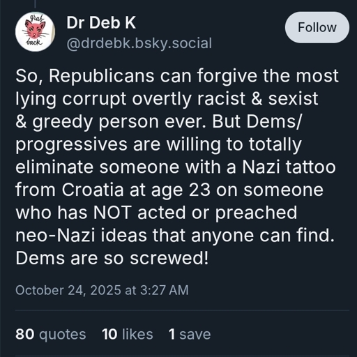 17·7 days agoHates ‘one party states’ but also wants democrats to win everytime.