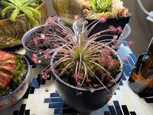 I hear they like warm roots and appreciate a heat pad underneath, so far the black planter it’s in seems to be keeping it warm enough. If I ever notice it reducing in dewiness I might try a heating pad though.