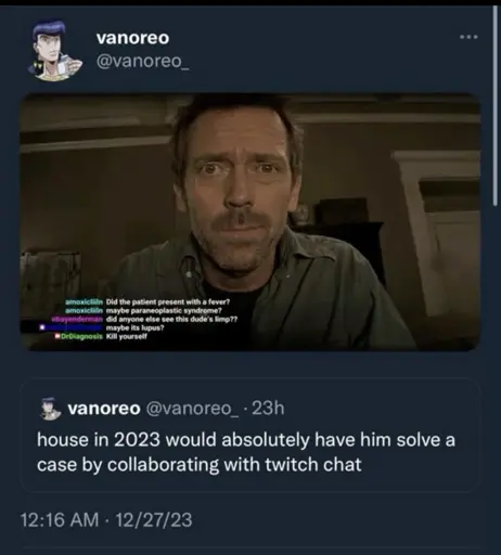 6·1 month agoTwitter user HalimedeMF (not sure if i should link to that site here), the internet’s greatest chaser and character from Heaven Will Be Mine.